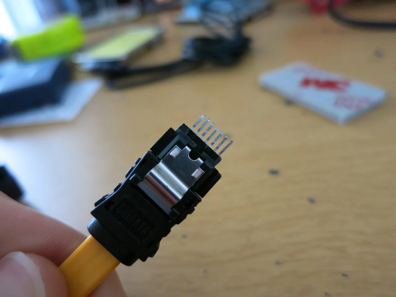 先程取り出したコネクタの端子を爪付きのSATAケーブルに差し、HDDに位置を合わせながら固定し、ハンダ付け。