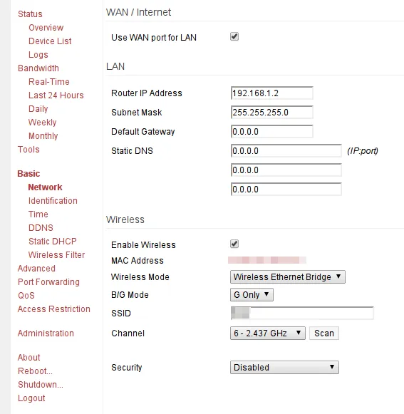 ※今回は実験も兼ねていたので何も設定しなかったが、WEP(B11はWEPしか対応していない)でパスワードをかけて、さらにMACアドレスの制限で子ルーターのみ接続可能にしておく必要があると思われる。