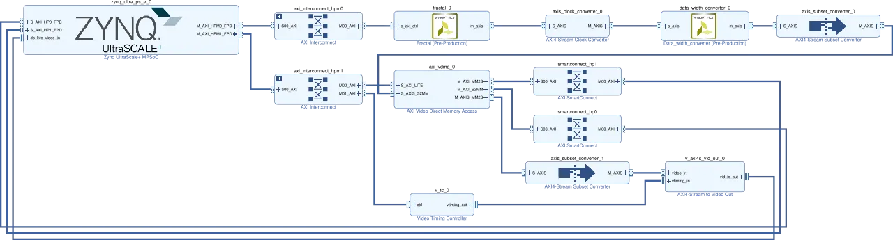前述したコードからもわかるように、Julia set の描画はそこそこの計算量があります。これをいかに速く計算するかは長く研究されているようで、いろいろなアプローチが見つかります。今回は Zynq UltraScale+ MPSoC のプログラマブルな回路側 (Programmable Logic, PL) に Julia set の描画専用の回路を構築することで高速に描画することを試みてみました。