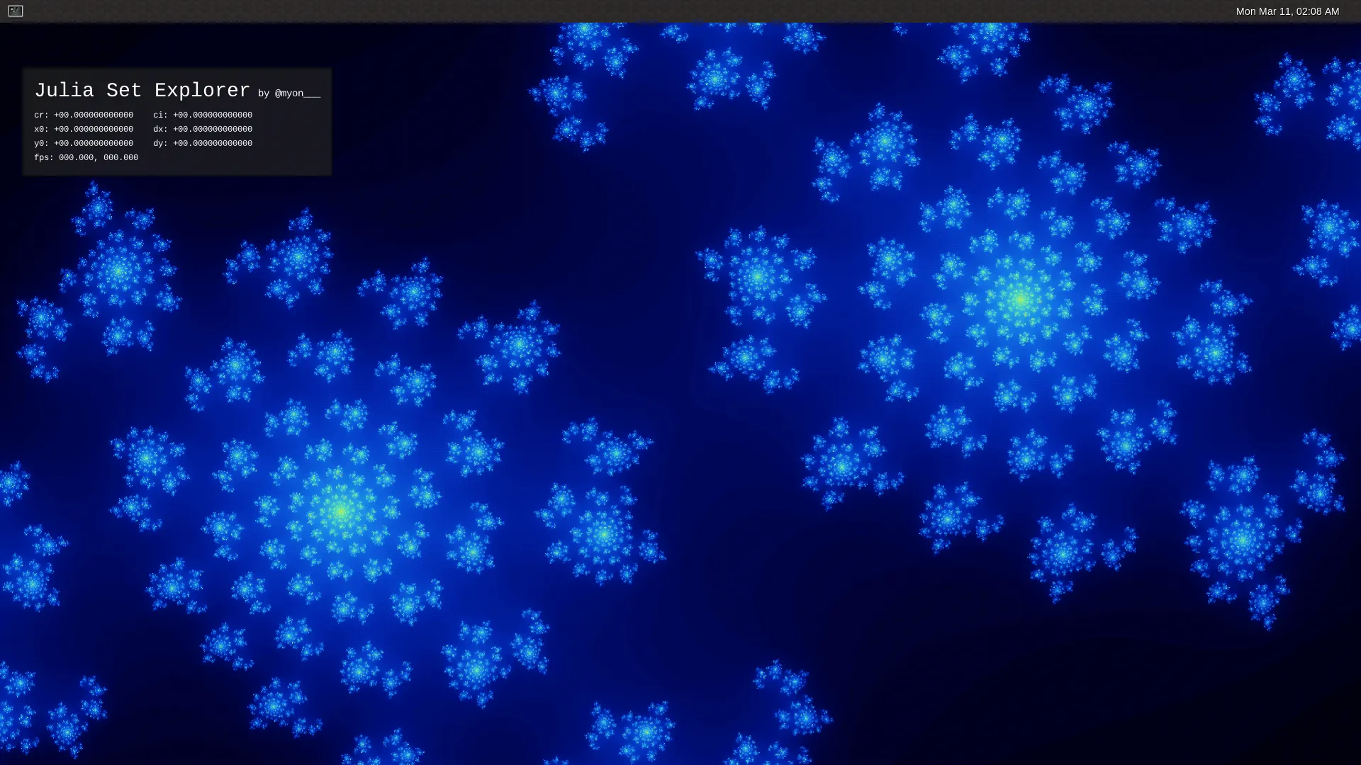 Julia set はフラクタルとして知られる図形の1つです。同様の図形だと Mandelbrot set のほうが有名かもしれませんが、個人的にはこっちのほうが好きです。